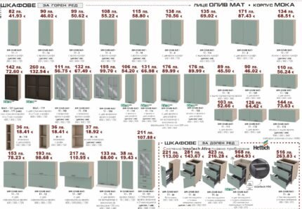 Модули горен ред: МФ-Олив мат-11-111; МФ-Олив мат-11-111; МФ-Олив мат-11-112; МФ-Олив мат-11-112; МФ-Олив мат-11-112; МФ-Олив мат-11-111; МАЛ-119; МАЛ-119; МАЛ-119;