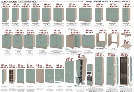 Модули долен ред: МФ-Олив мат-11-50; МФ-Олив мат-11-48; МФ-Олив мат-11-55; МФ-Олив мат-11-23; МФ-Олив мат-11-23; МФ-Олив мат-11-60
