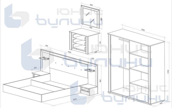 Посочената цена включва:легло с нощни шкафчета и гардероб