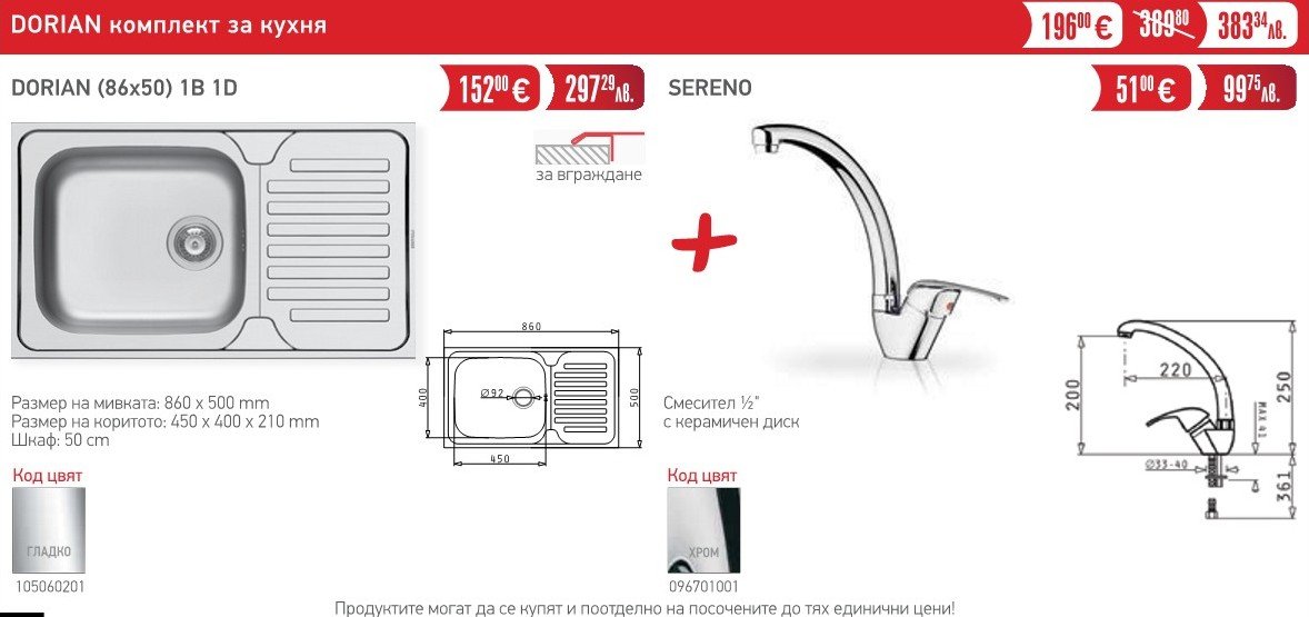 Комплектът включва: Мивка Dorian ( 86×50 ) 1B 1D + смесител Sereno