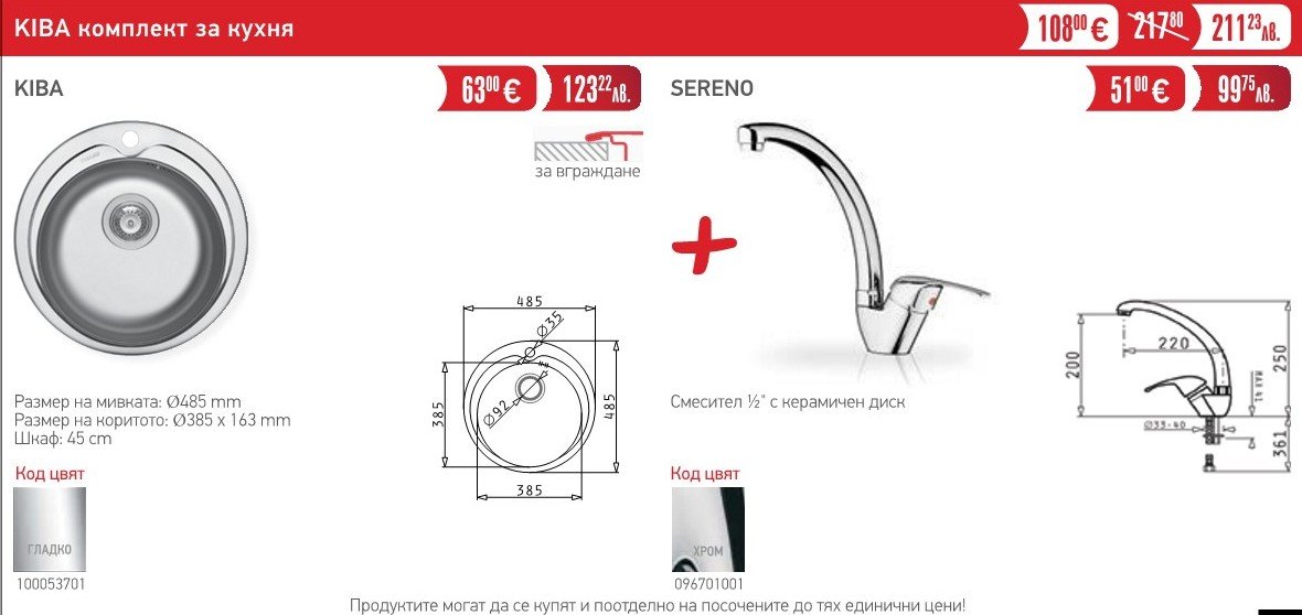 Комплектът включва: Мивка Kiba + смесител Sereno