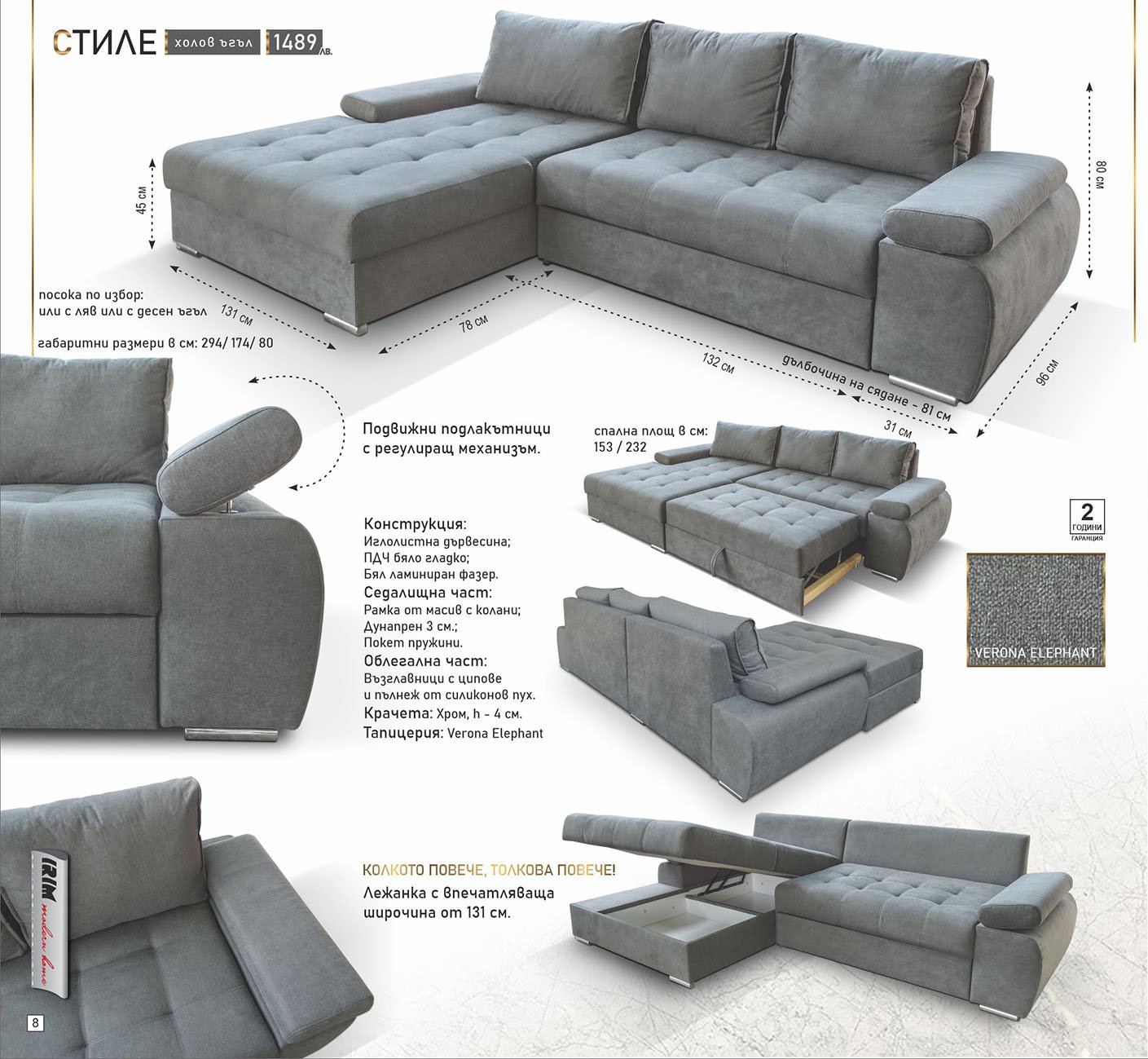 Стиле е модел с минималистично, семпло, но изтънчено излъчване. Съвършеното удобство е постигнато с подвижни подлакътници, които да се настроят на перфектната за всеки височина и влагането на покет пружини. Лежанката е по-широка от обикновено и е напълно подходяща за двама.